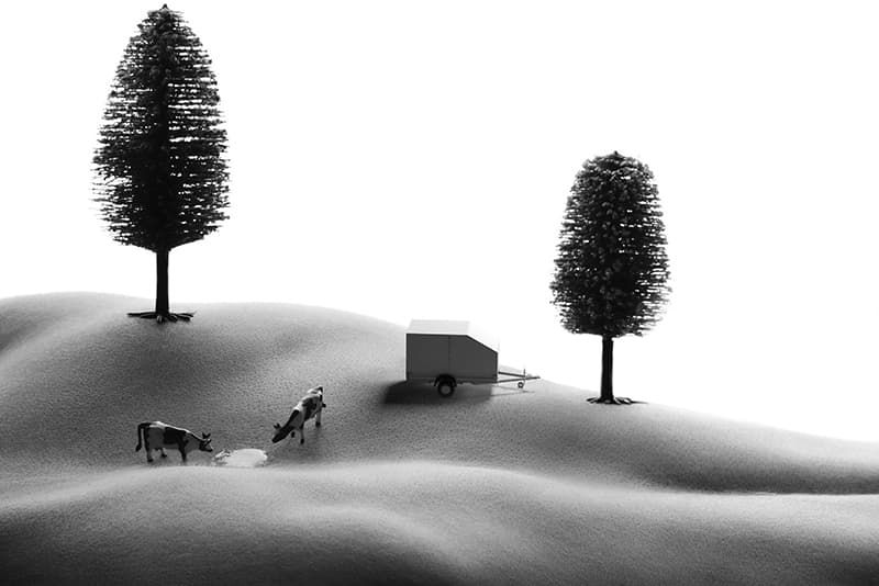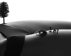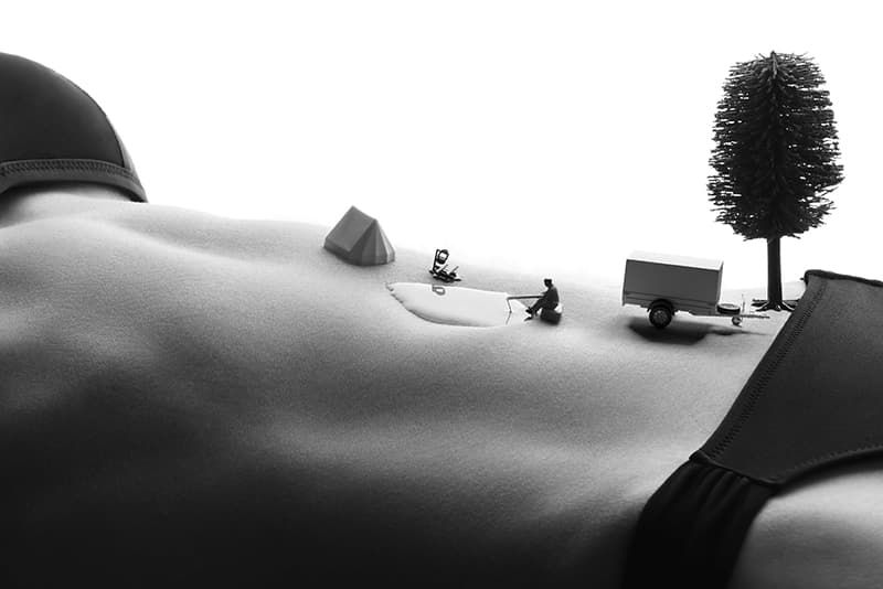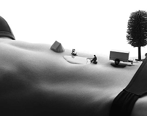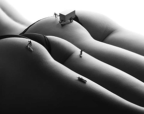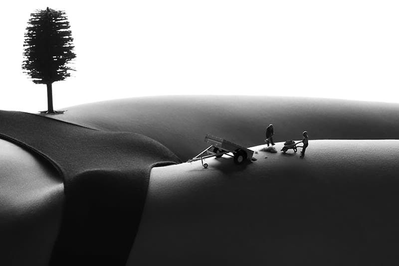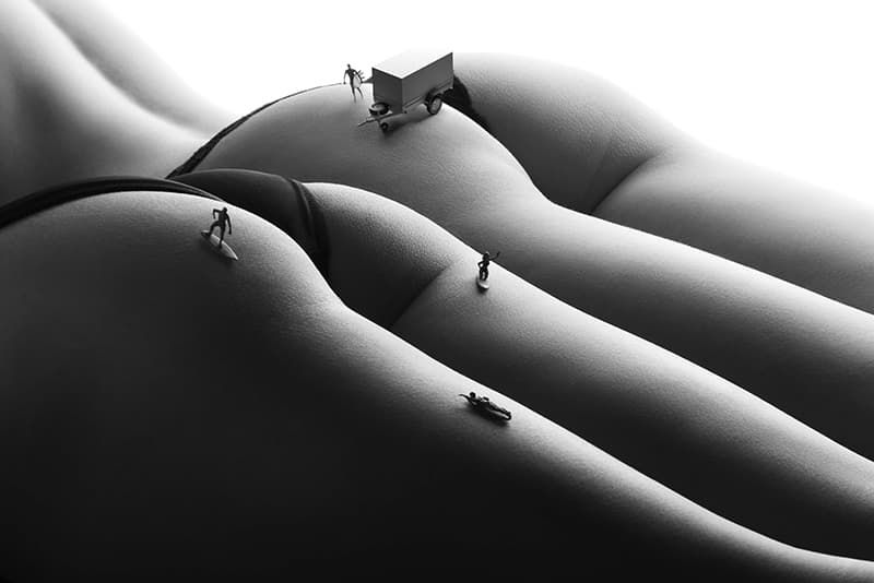 Женские тела с их волнующими и изящными изгибами создают удивительные пейзажи: горы, равнины, озера, волны в океане и снежные склоны. На телах девушек расставлены крошечные фигурки людей, животных, предметы быта и, конечно, прицепы.